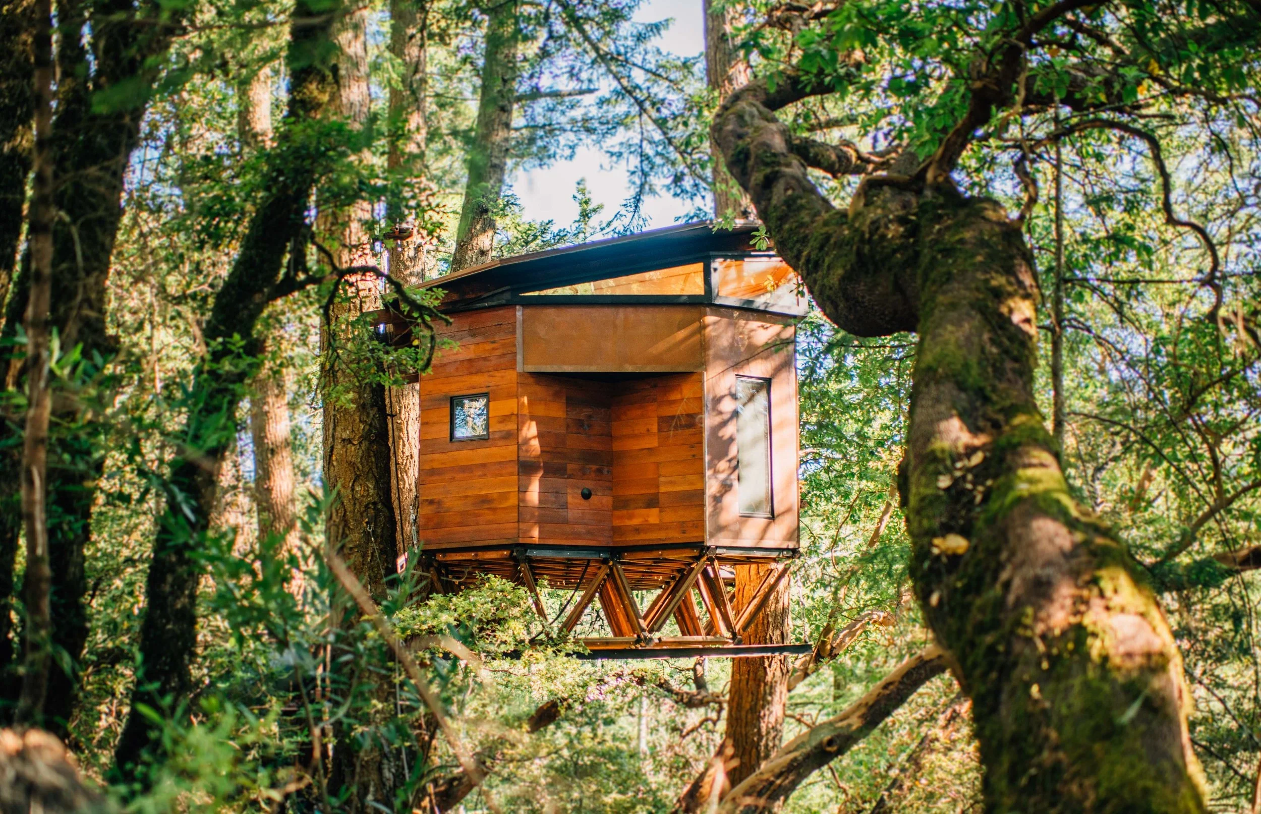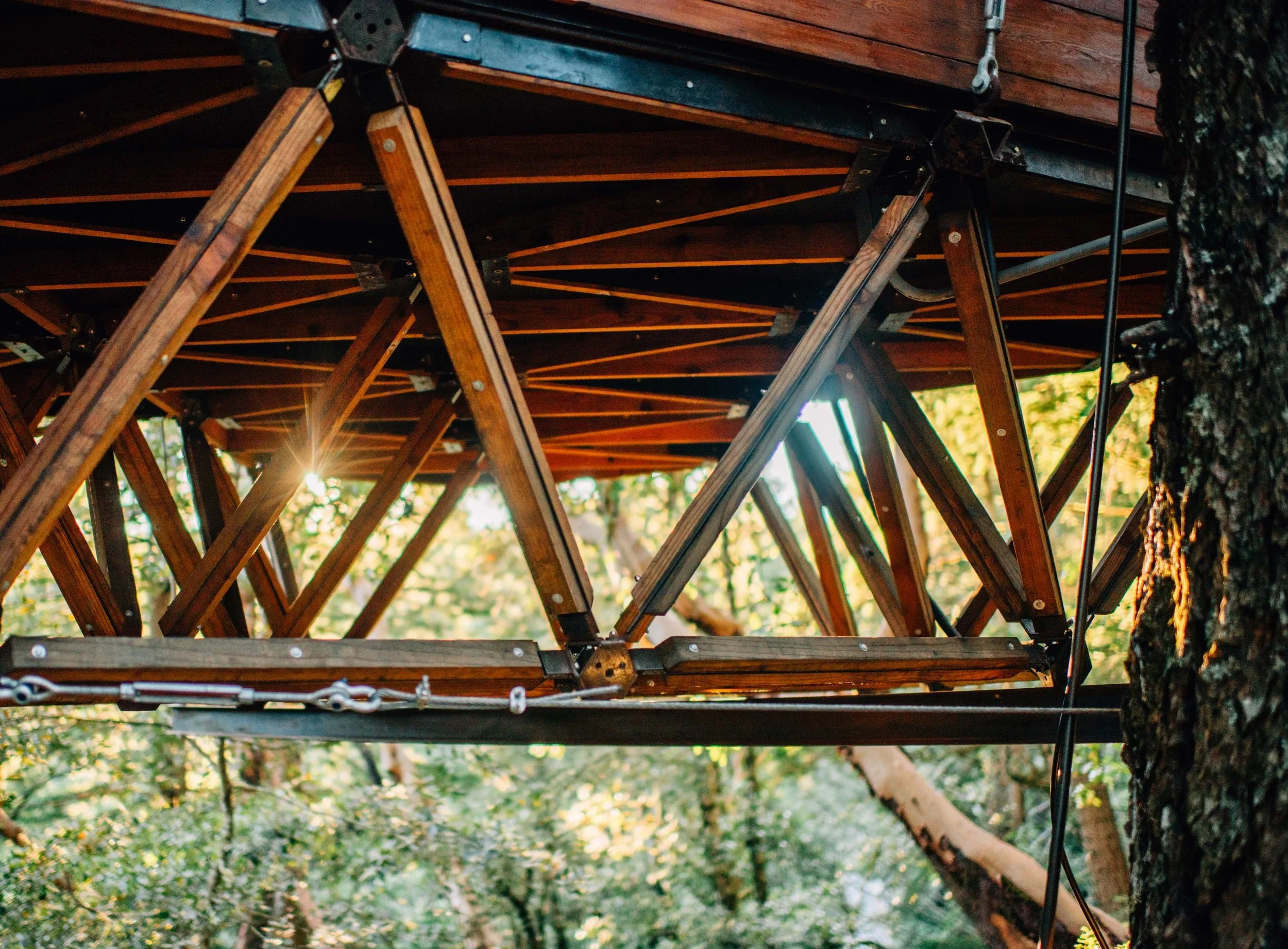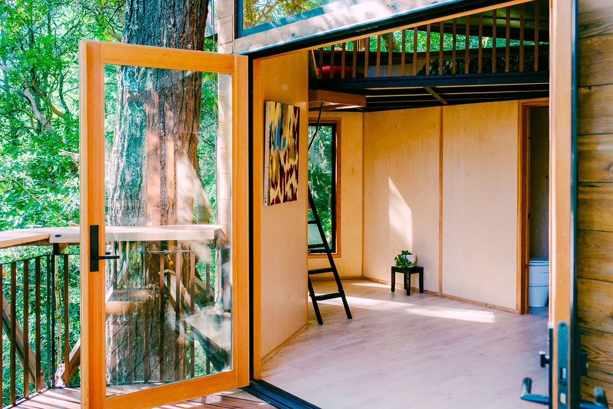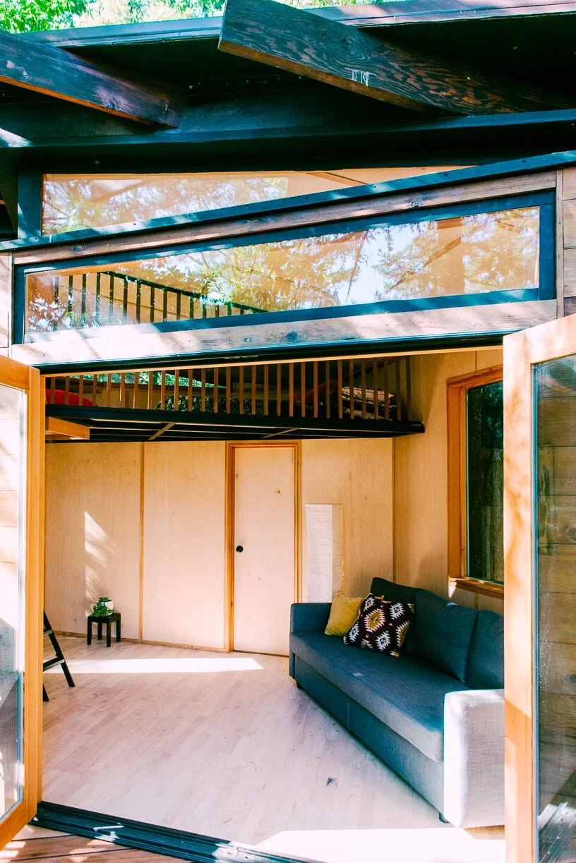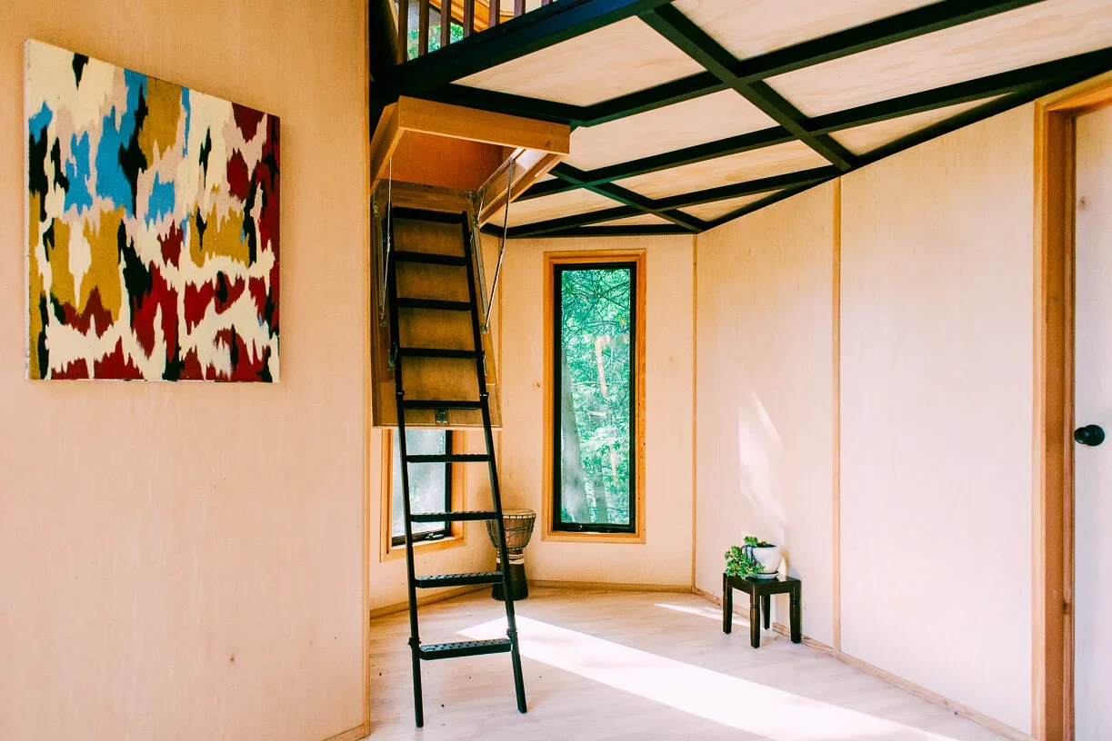 The Madrone Grove represents the evolution of our Equilibrium Home series, featuring the largest floor area yet while maintaining an intimate connection with its forest setting. The Tetratruss foundation was precisely engineered to weave between the surrounding grove, wrapping around trees rather than displacing them. Prefabricated SIP walls rise tall, clad in local redwood and copper, while expansive glass entryways flood maple plywood interiors with natural light. Family life unfolds across multiple zones—an elevated loft for quiet retreats, a grand exterior deck for gatherings, and a playful winding slide that adds joy to daily movement. This warm, illuminated sanctuary demonstrates how modular construction can create spacious yet site-sensitive homes that bring the best of outdoor living inside.