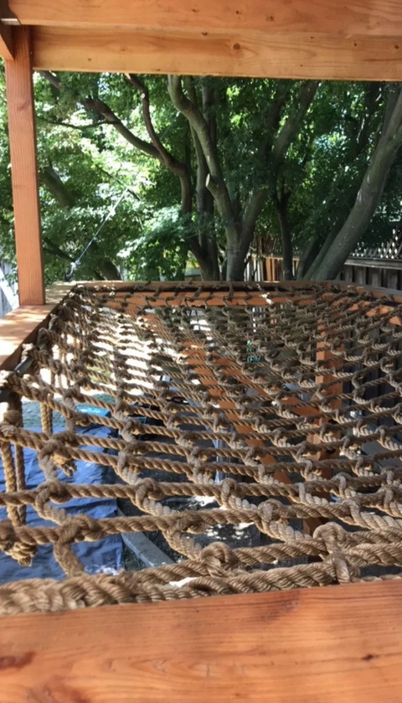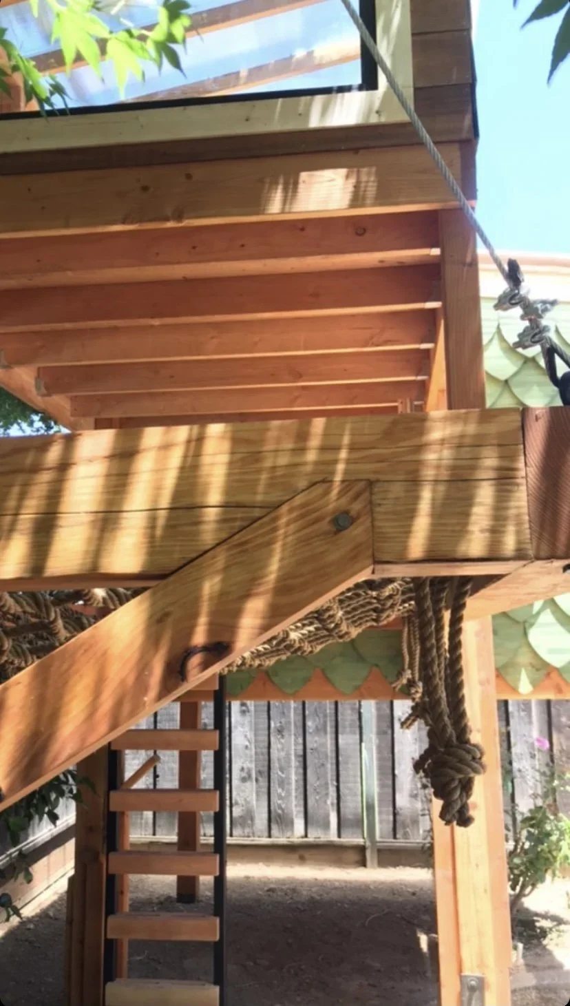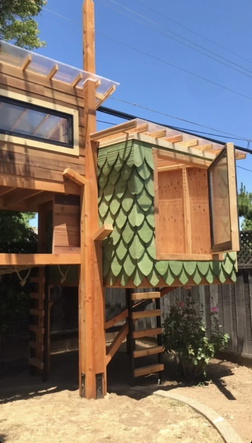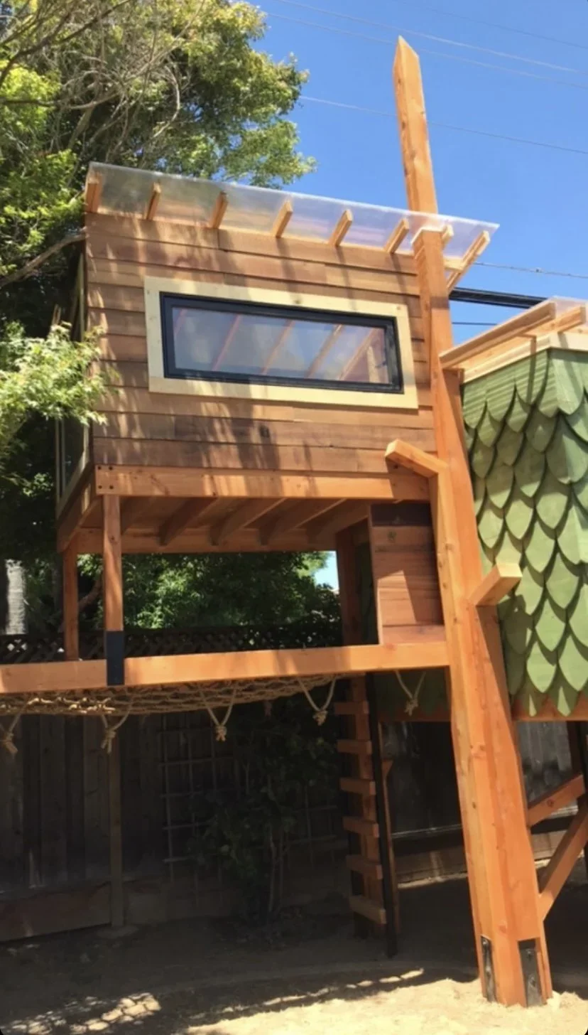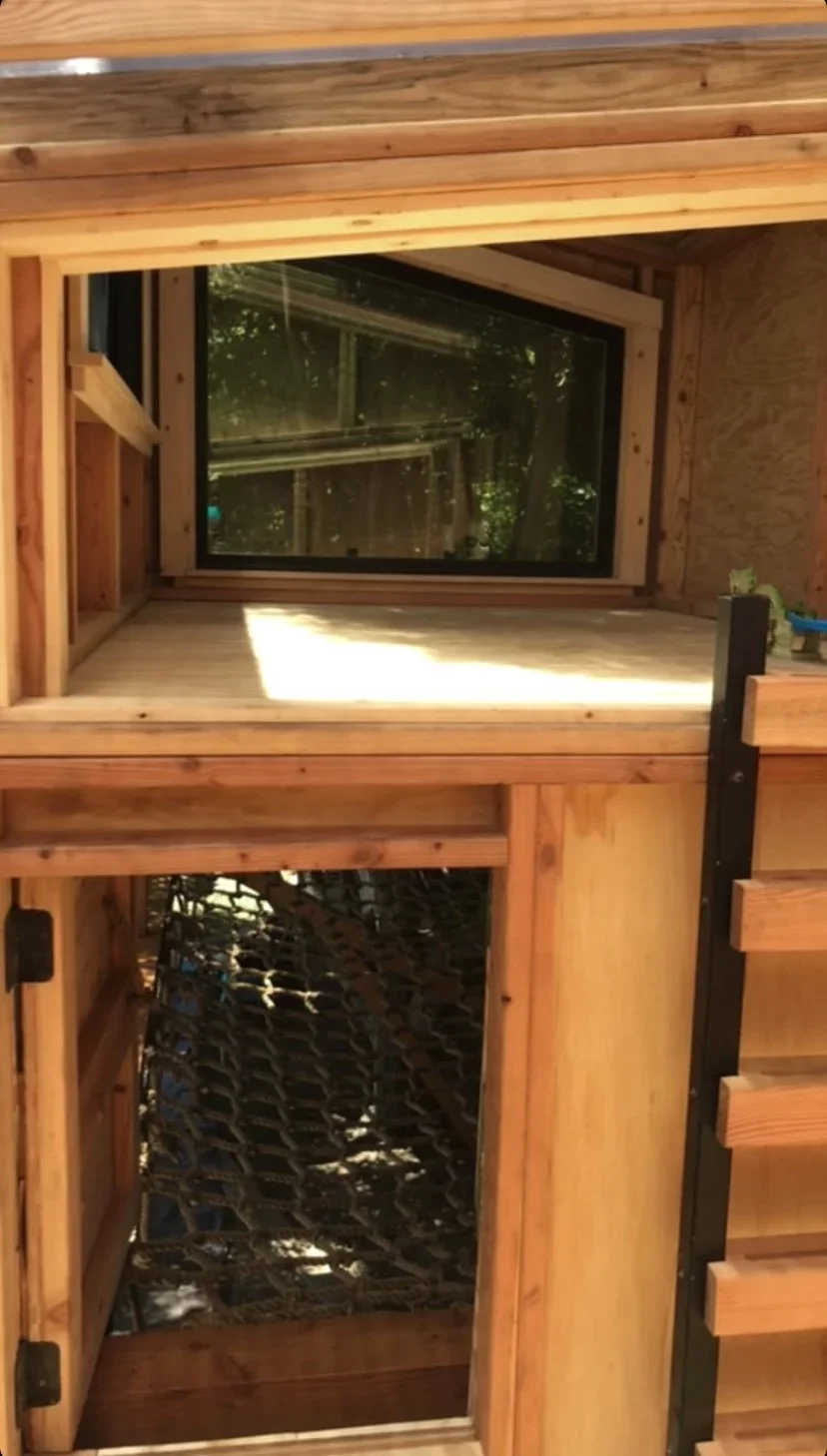 An imaginative bungalow with a scaley style! Creatively structured as a treehouse with no tree, the separate play areas branch off a central pillar. This treehouse features a lounge net, wide operable window, climbable loft and kid’s size large main room.