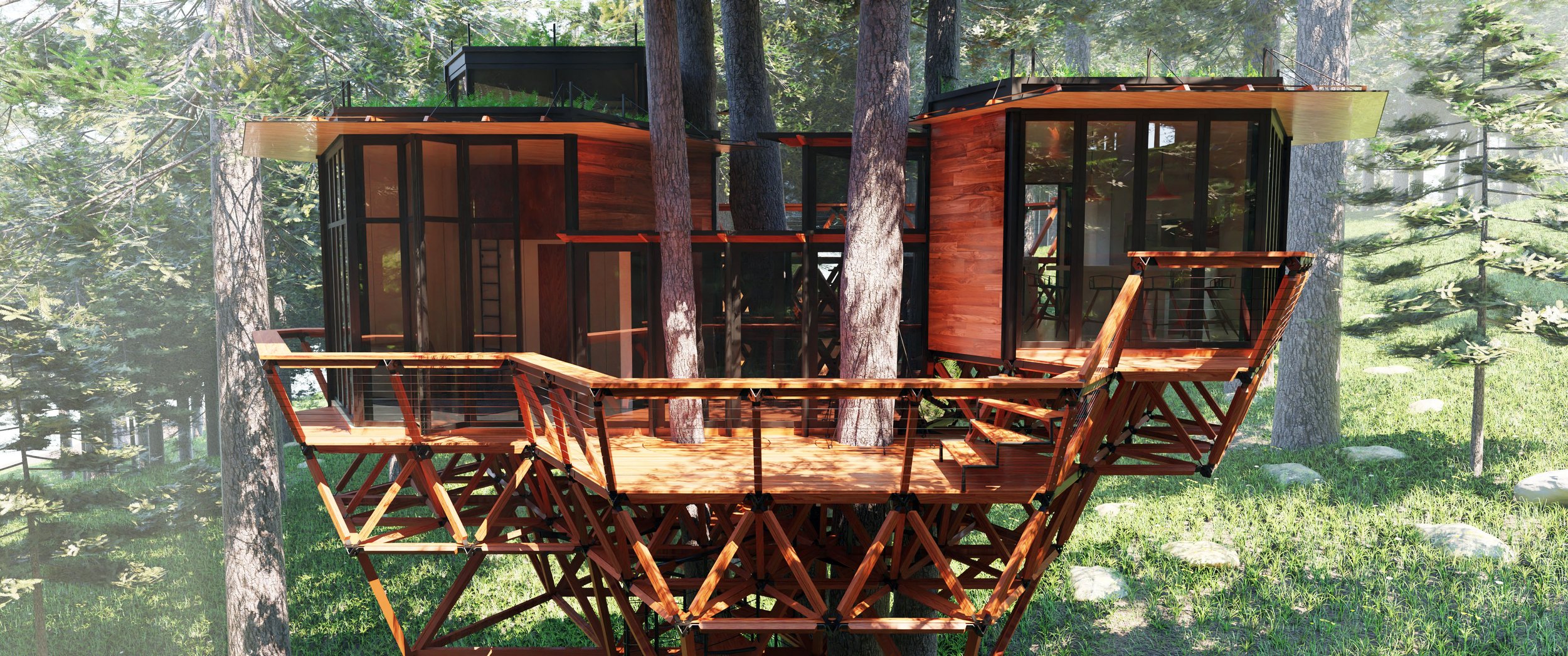 The Tetratruss foundation was iterated to fit snugly between the surrounding grove of trees, wrapping around and between them in several places. Built for the whole family to get away and have their own space, the structure features an elevated loft, grand exterior deck, and winding slide separated from the greater interior space. The large glass entryway and surrounding windows combine with maple plywood interiors for a very warm, illuminated, and airy living space bringing the best of the outdoors into the home.