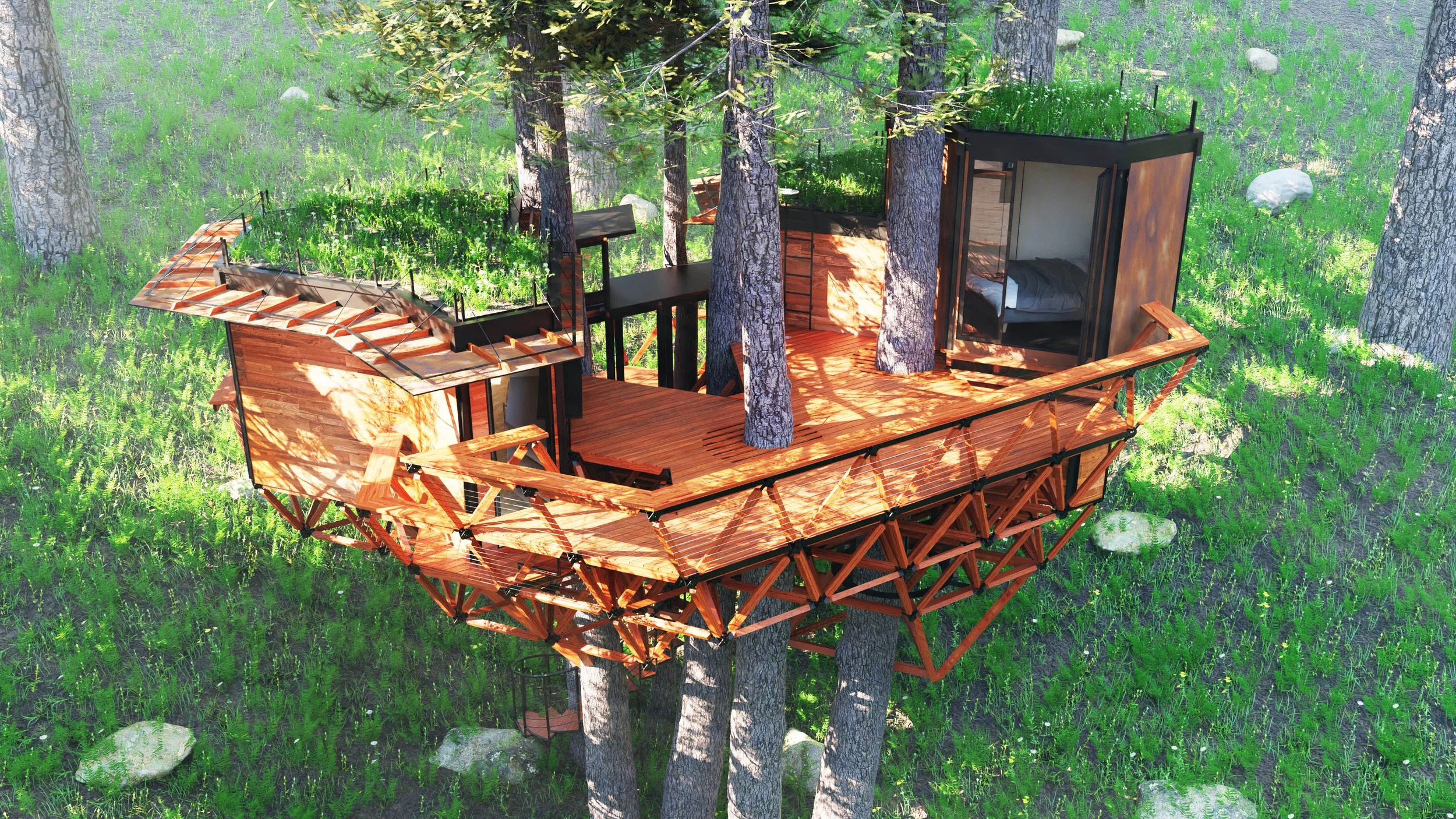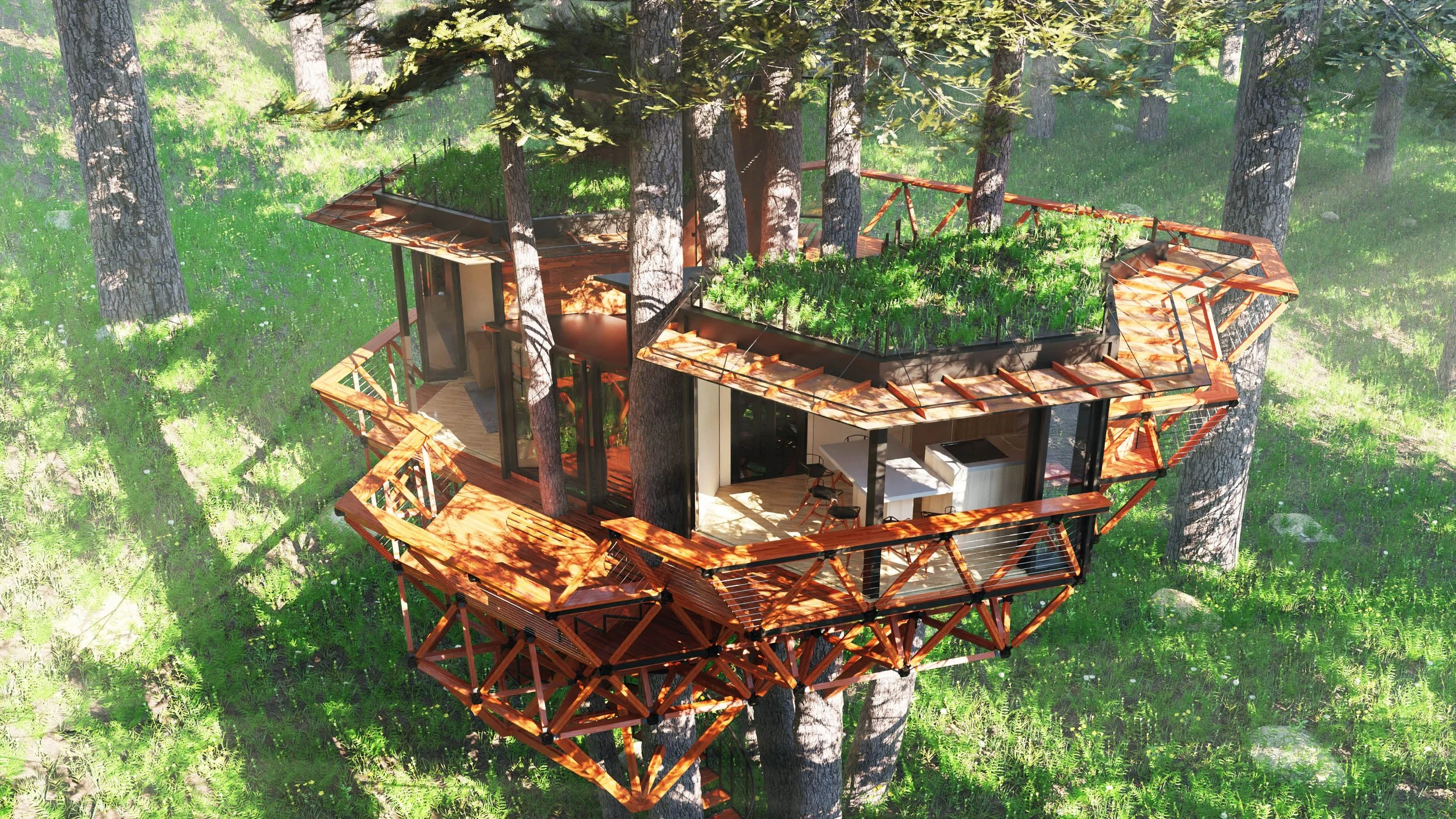 Tetratruss adapts to your site's unique conditions, working with the landscape rather than against it. The system can weave between trees, follow natural contours, and create living spaces that feel like natural extensions of their environment.